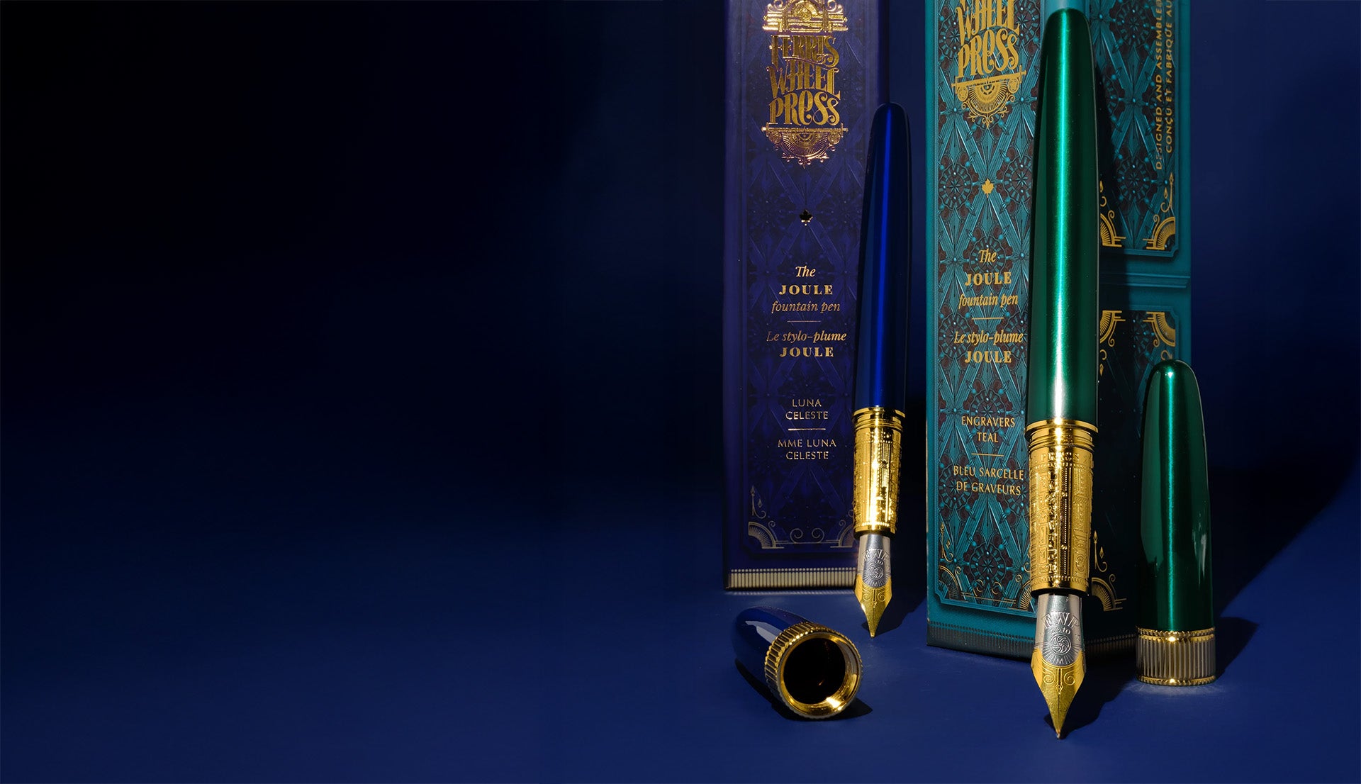 Ferris Wheel Press | Joule Fountain Pen | Engravers Teal | Double Gold Plated, Sapphire Lacquer Finish | Two-Tone Steel Nib | Leather Sleeve/FineRegular price Dhs. 689.00 AEDRegular price-